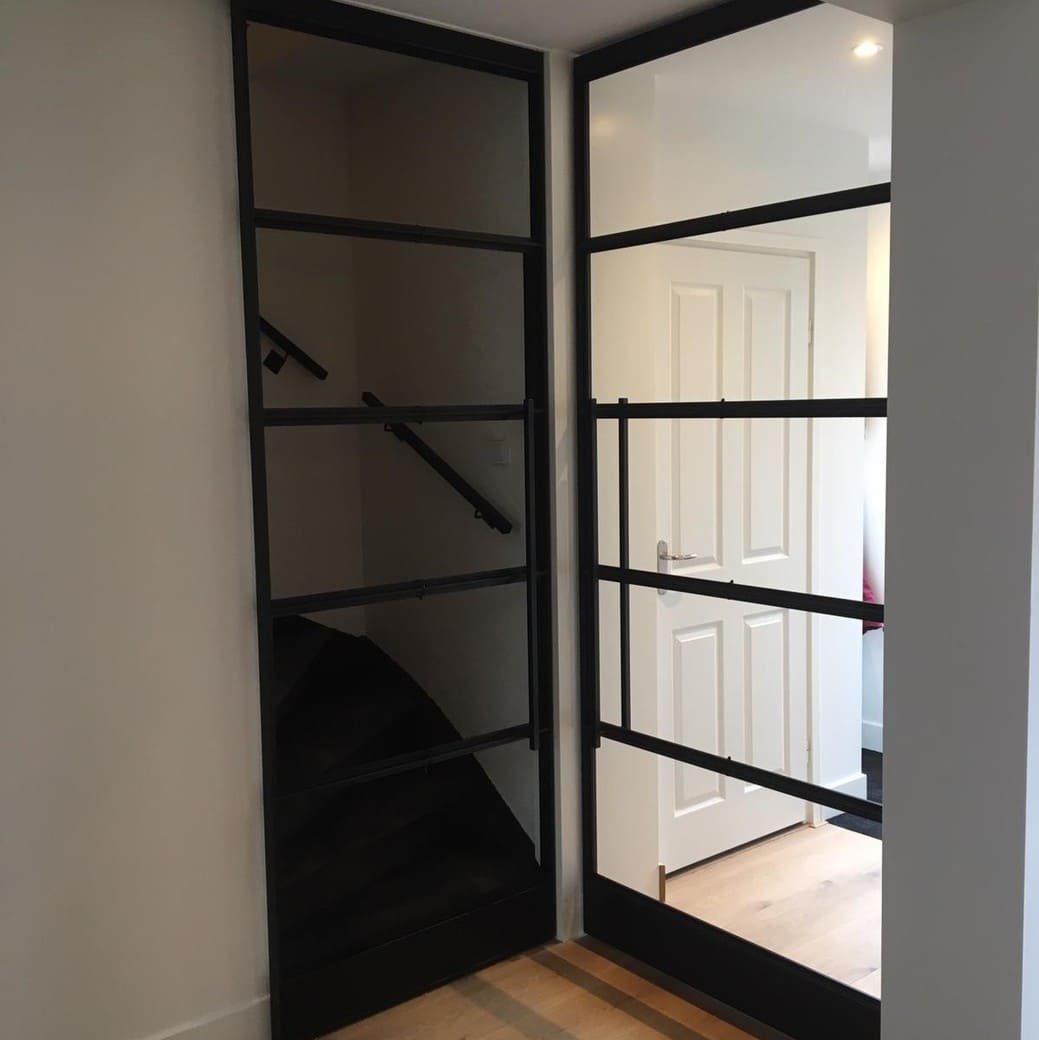Een schuifdeur in combinatie met een taatsdeur. Gemaakt van staal met zwarte poedercoating.