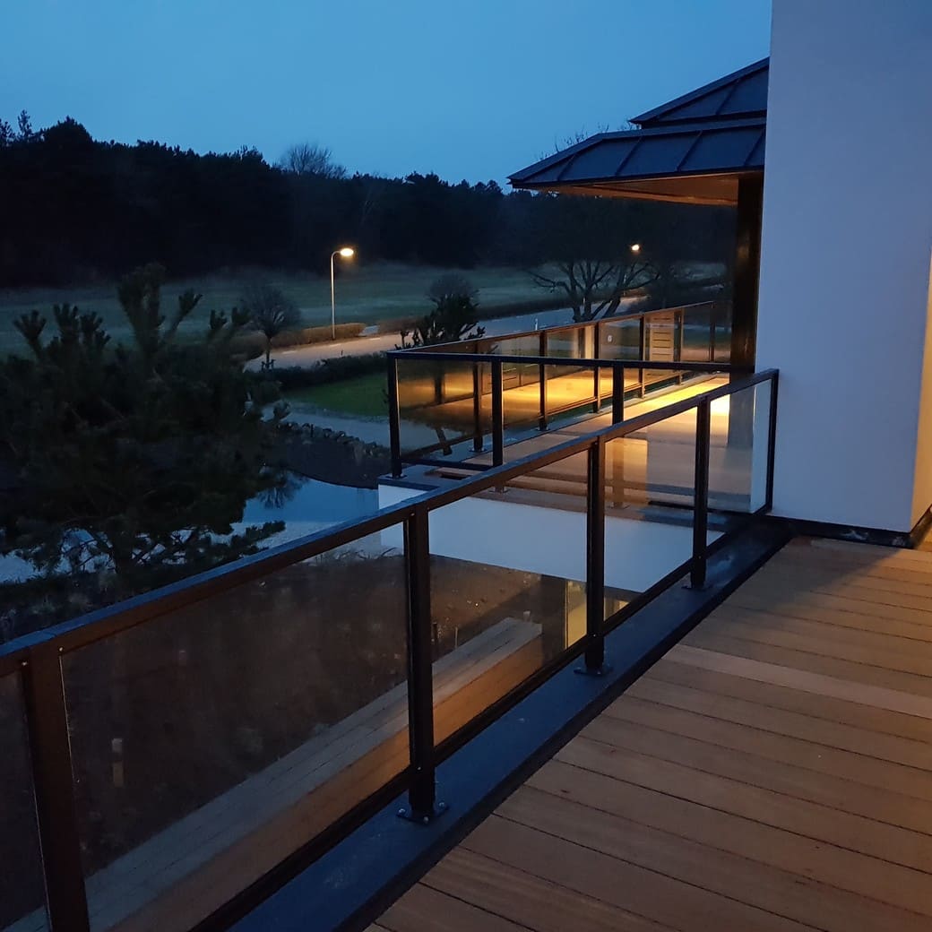 RVS 316 balustrade met glas. Opdracht is inclusief plaatsing en afwerking met poedercoating.