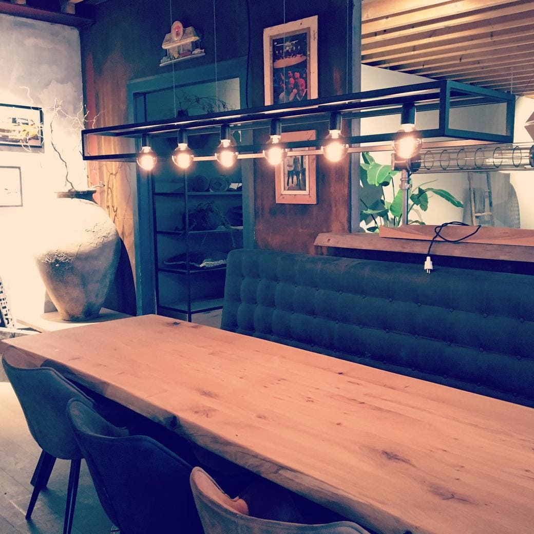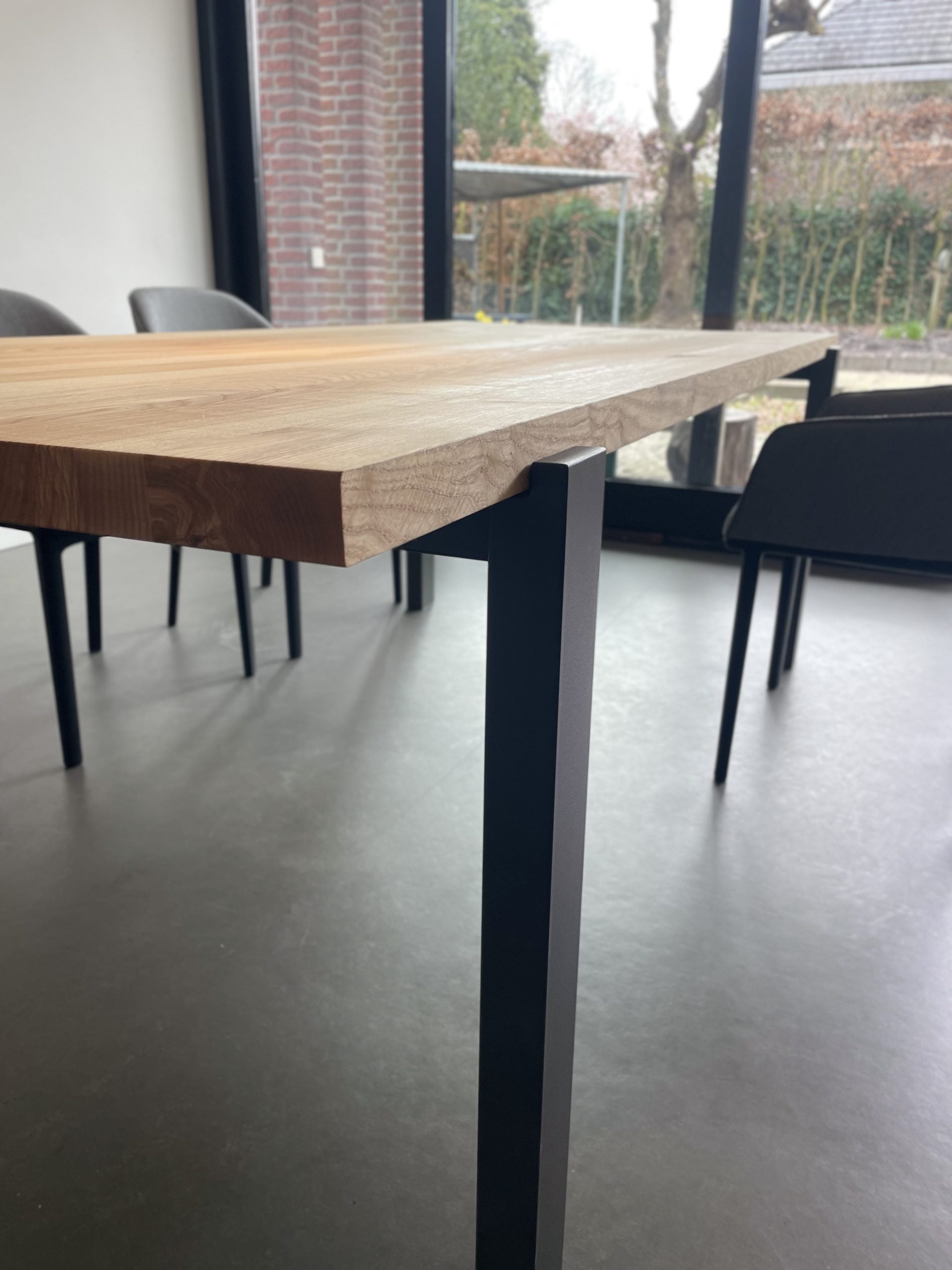 Unieke maatwerktafel waarbij het hout doorloopt in de stalen poten.